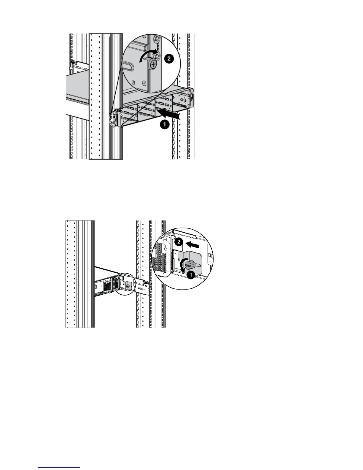 5. At the rear of the rack, loosen the thumbscrew on the shipping retaining bracket (1,
