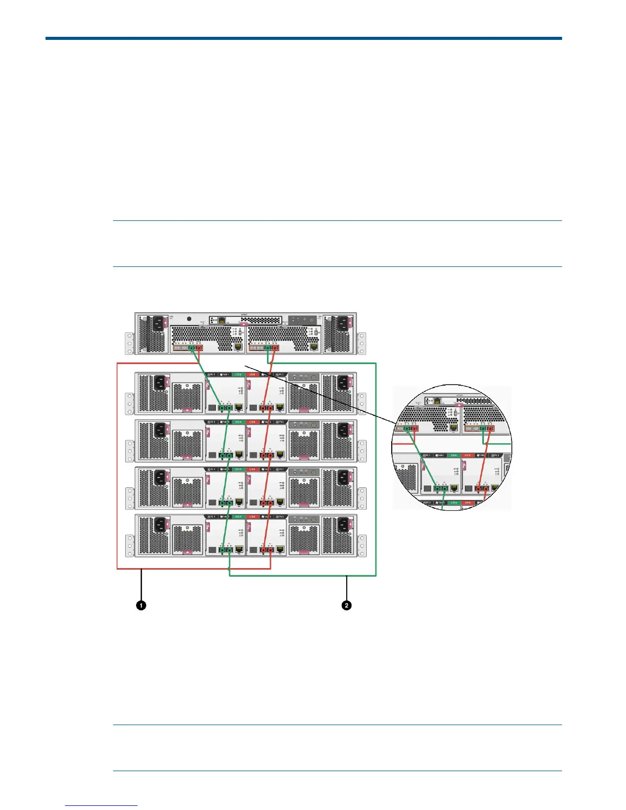 • For configurations with the controller above the disk enclosures, attach the cables to the EVA
