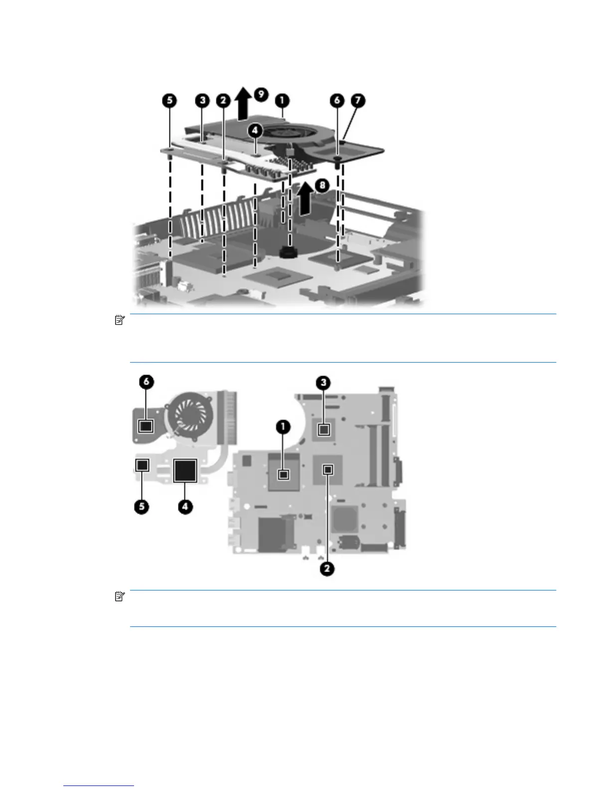 NOTE: The thermal material must be thoroughly cleaned from the surfaces of the system board