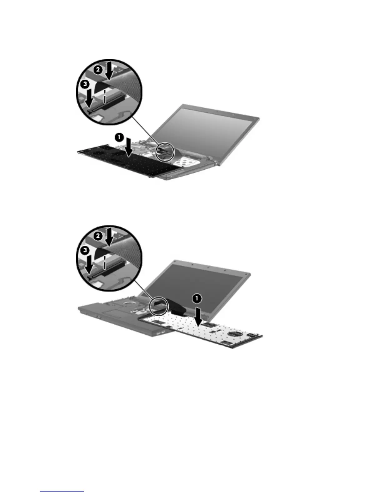 10. Insert the keyboard cable (2) into the ZIF connector (3) on the system board and secure the