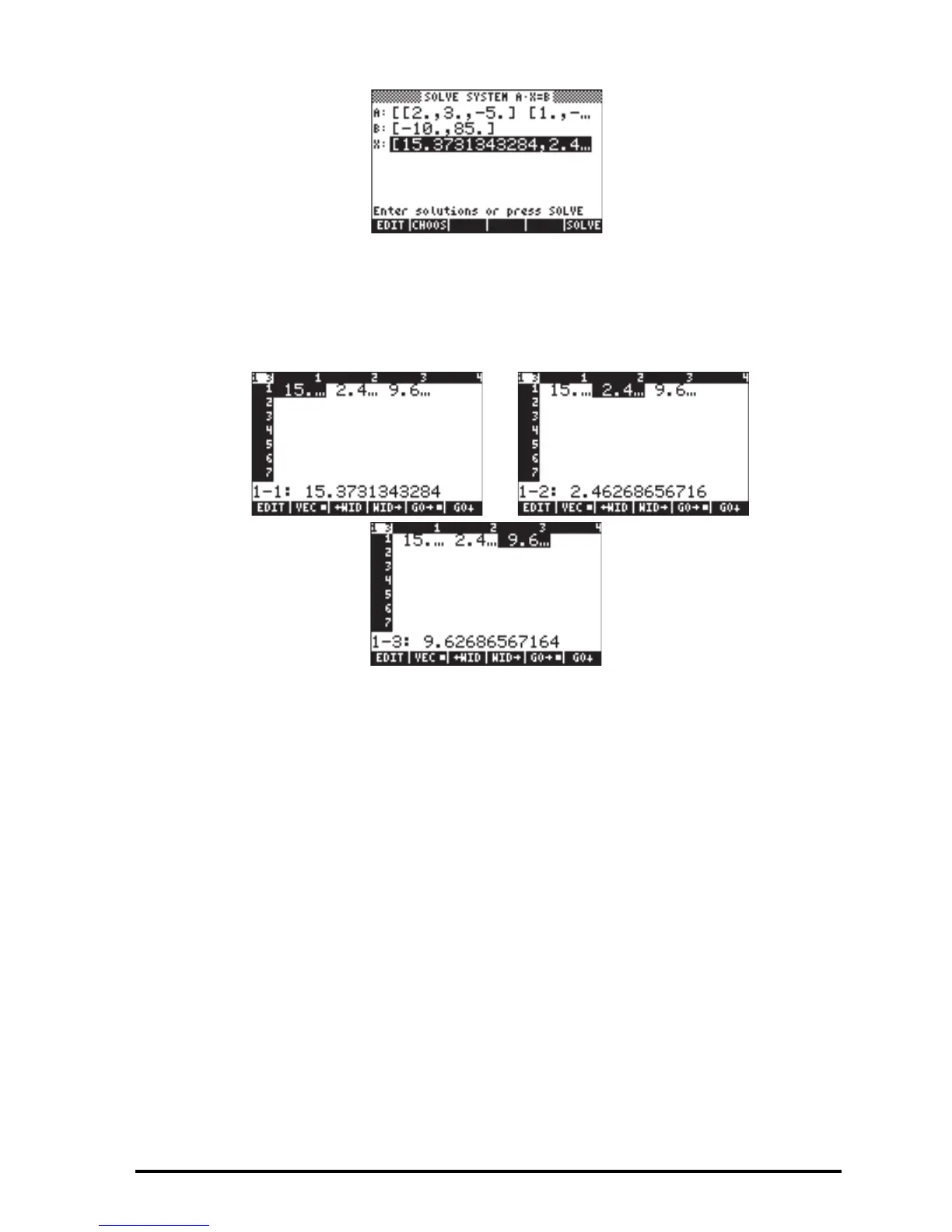 • Press ˜ ˜@CALC@ `, to copy solution vector X onto the stack.
