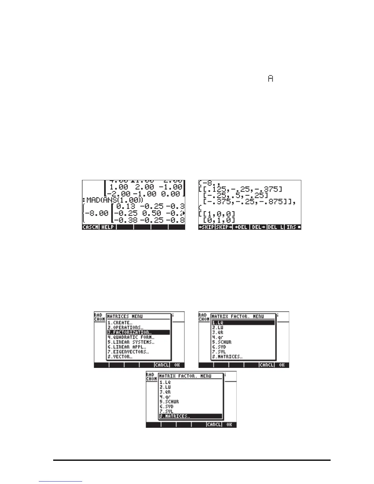 Function contained in this menu are: LQ, LU, QR,SCHUR, SVD, SVL.