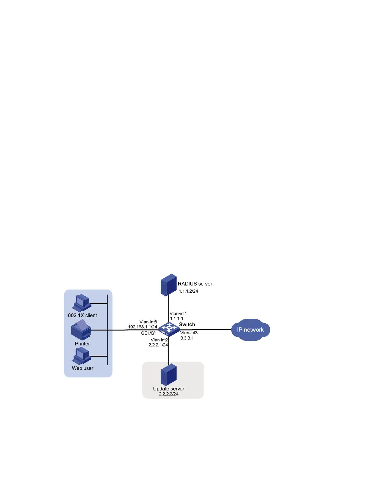 Figure 68 Network diagram for triple authentication supporting VLAN assignment and Auth-Fail VLAN