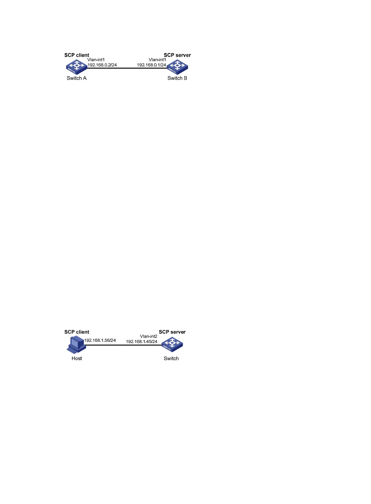 As shown in Figure 100, the switch acts as the SCP server, and the host acts as the SCP client. The host