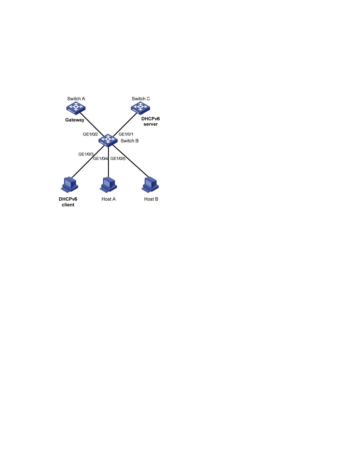 As shown in Figure 120, Switch B connects to the DHCPv6 server through interface GigabitEthernet