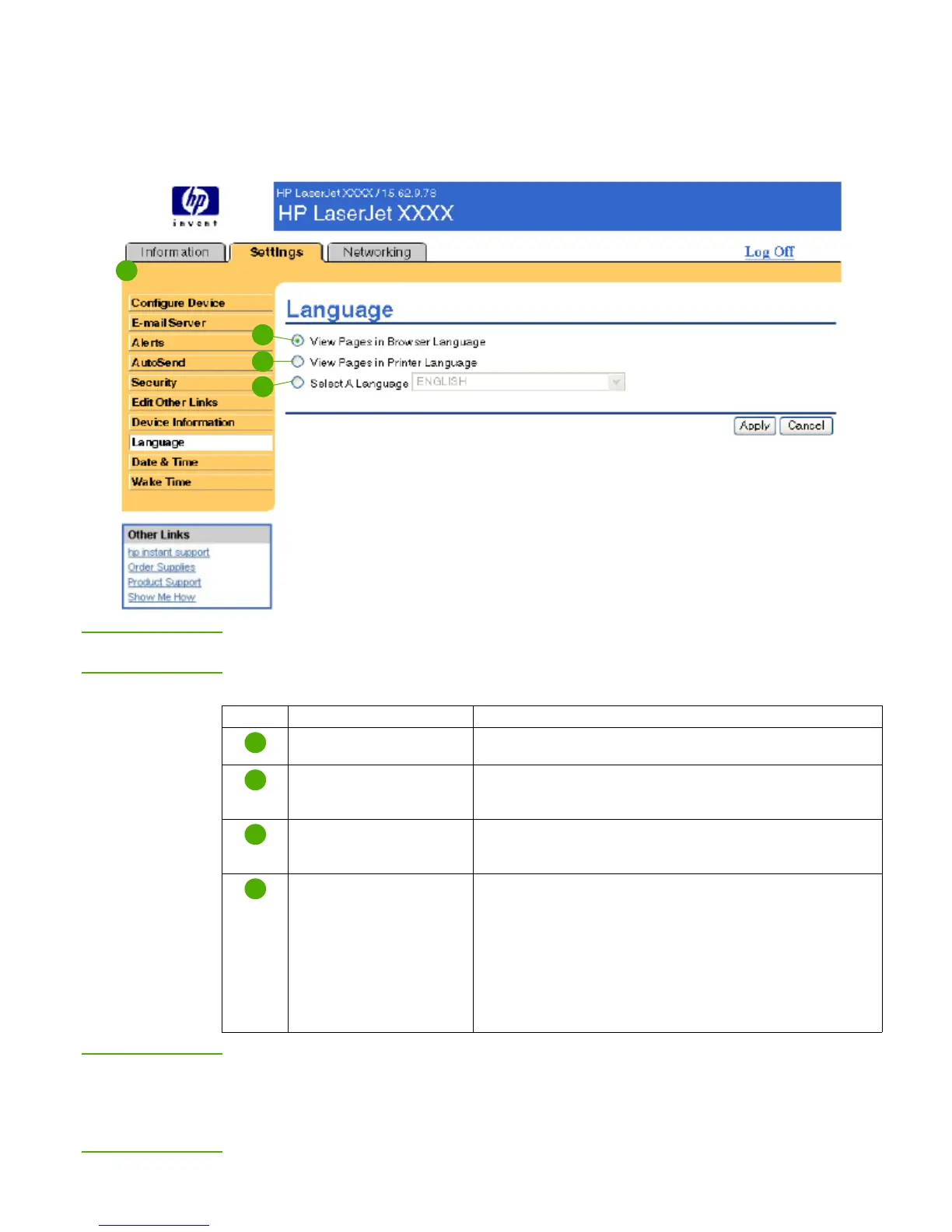 Use the Language screen to select the language in which the HP Embedded Web Server