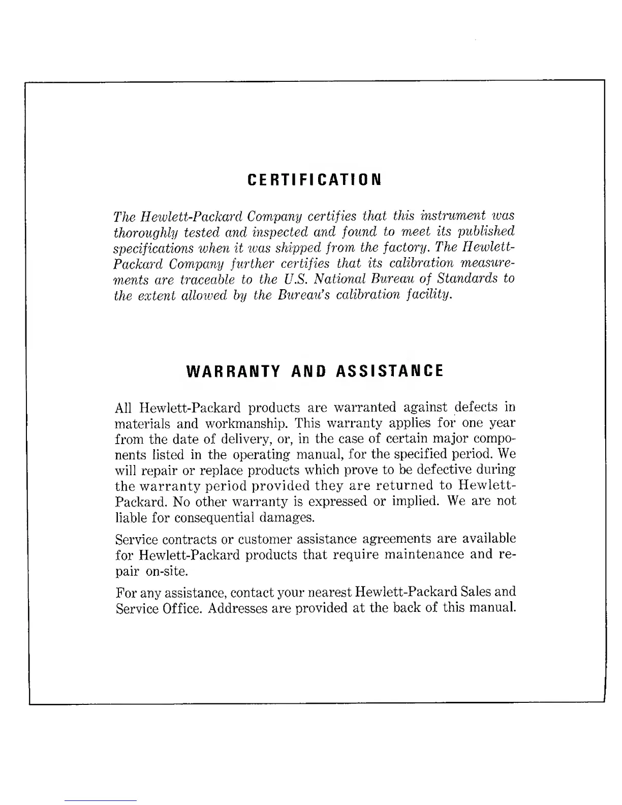 HP 5254C - CERTIFICATION; WARRANTY AND ASSISTANCE