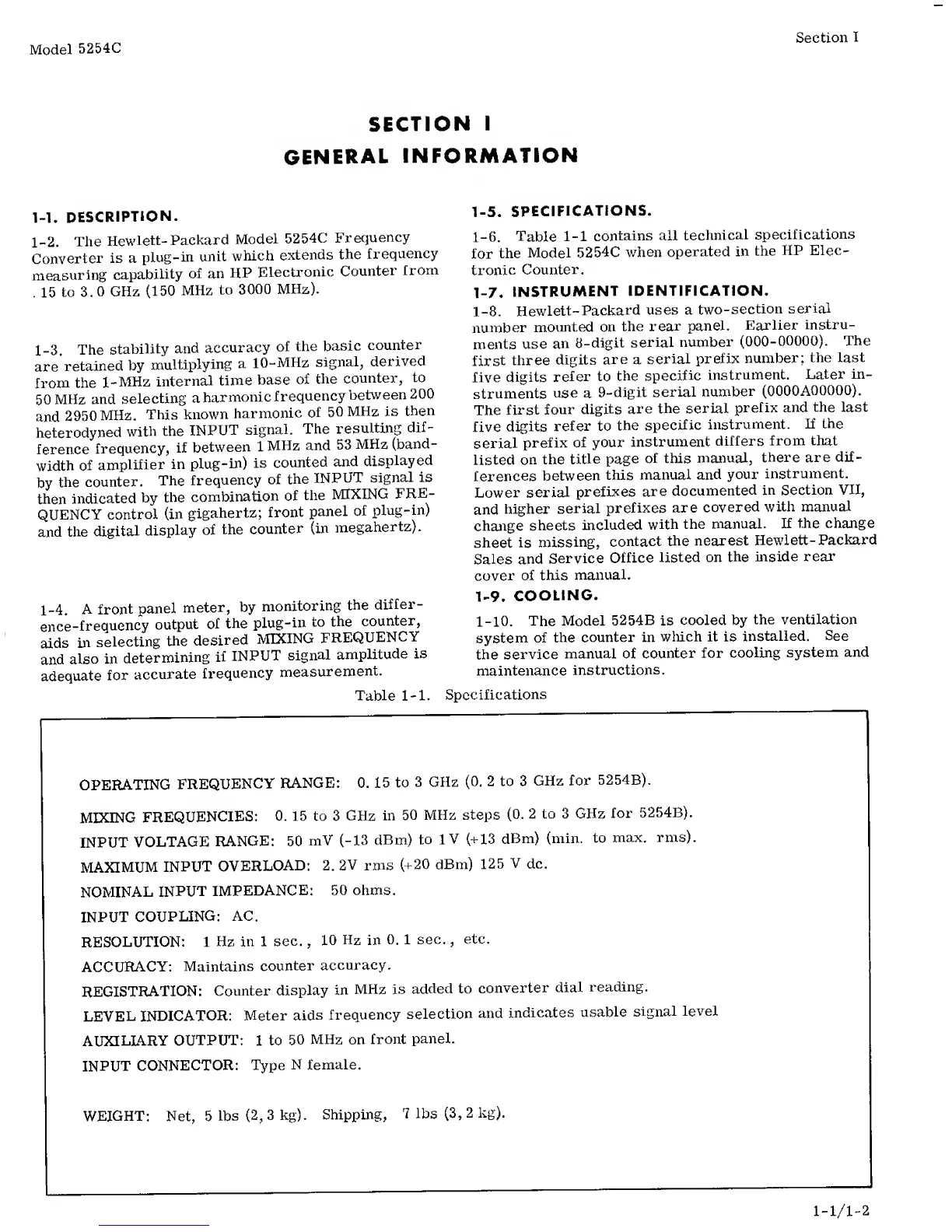 HP 5254C - SECTION I GENERAL INFORMATION; DESCRIPTION; SPECIFICATIONS; INSTRUMENT IDENTIFICATION