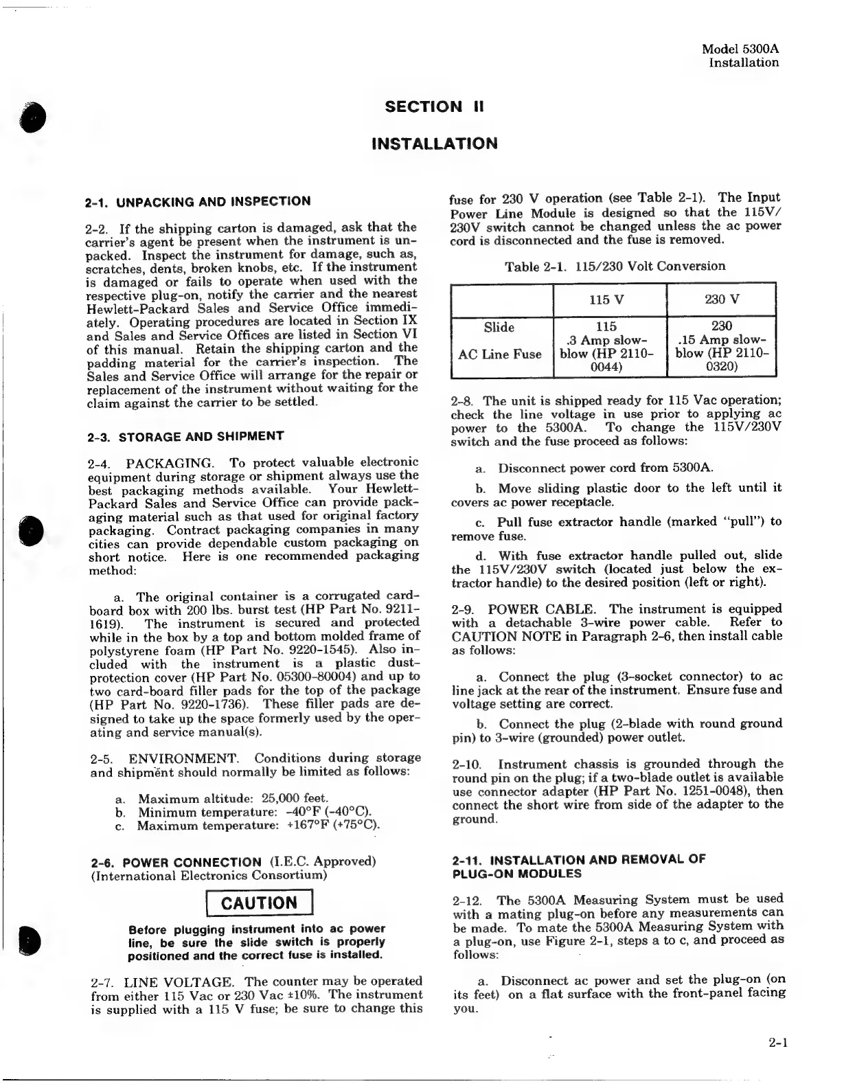 HP 5300A - Installation; Unpacking and Inspection; Storage and Shipment; Power Connection (I.E.C. Approved)