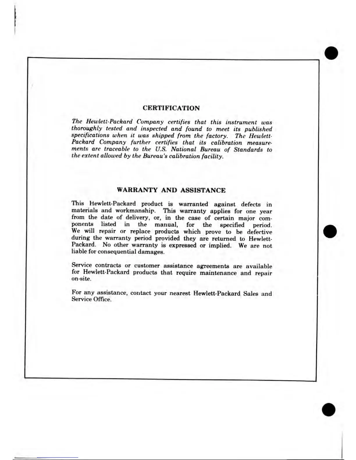 Hewlett-Packard Company certifies that this instrument