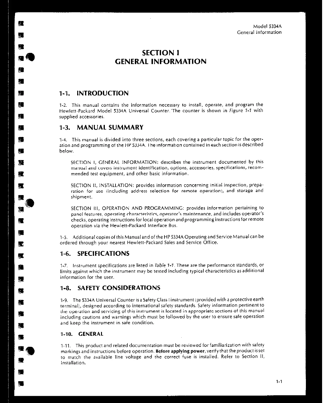 l-9. The 5334A Universal Counter isa Safety Class I instrument (provided with a protective earth