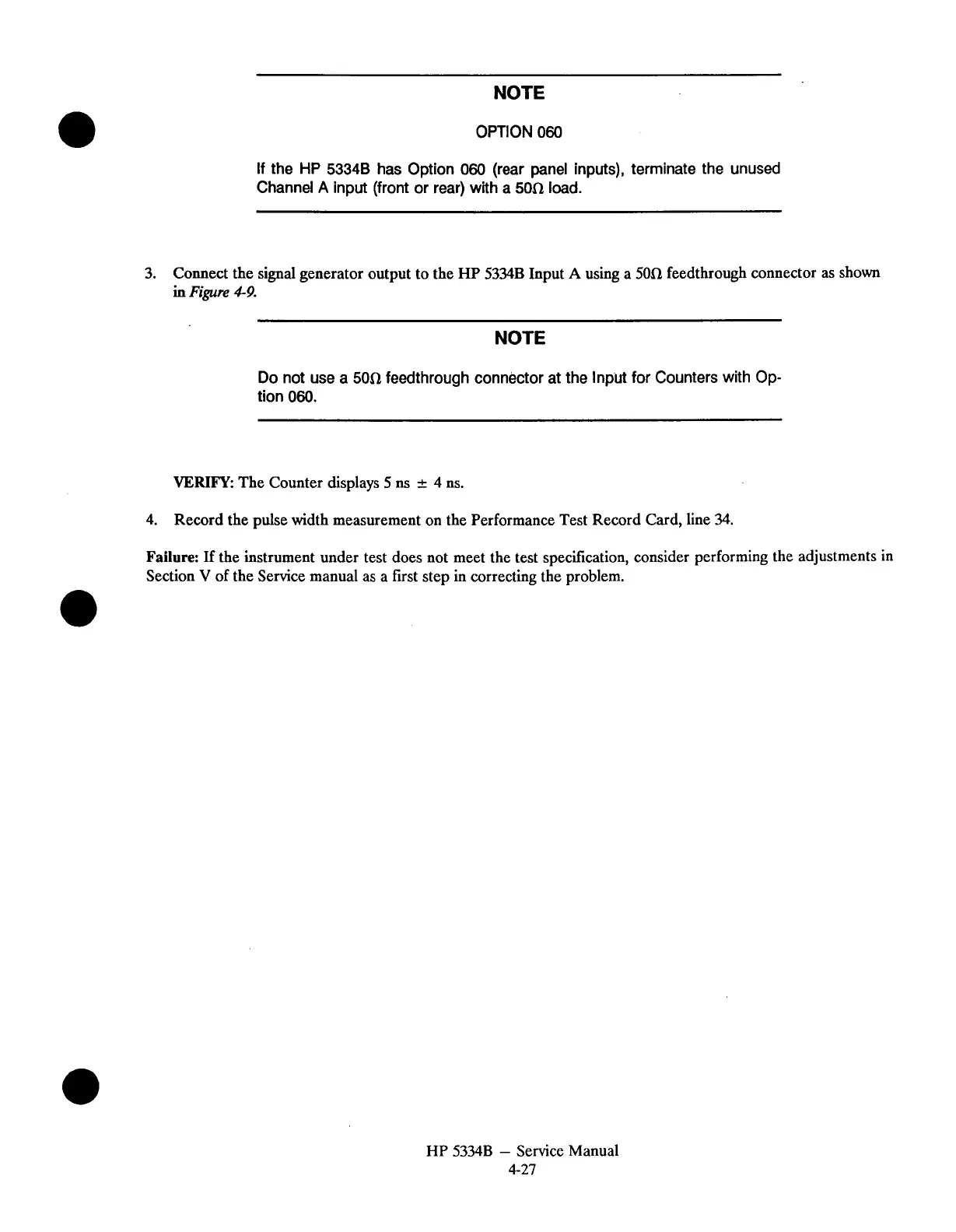 Record the pulse width measurement on the Performance Test Record Card, line