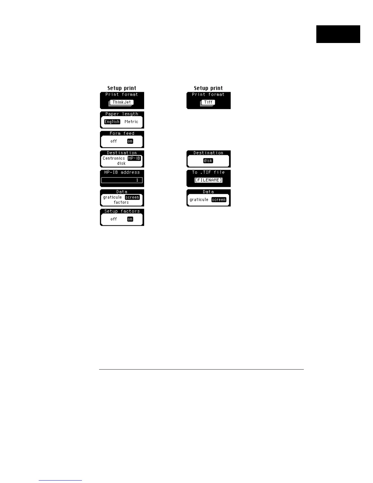 When you press the Setup print hardkey, a menu similar to these