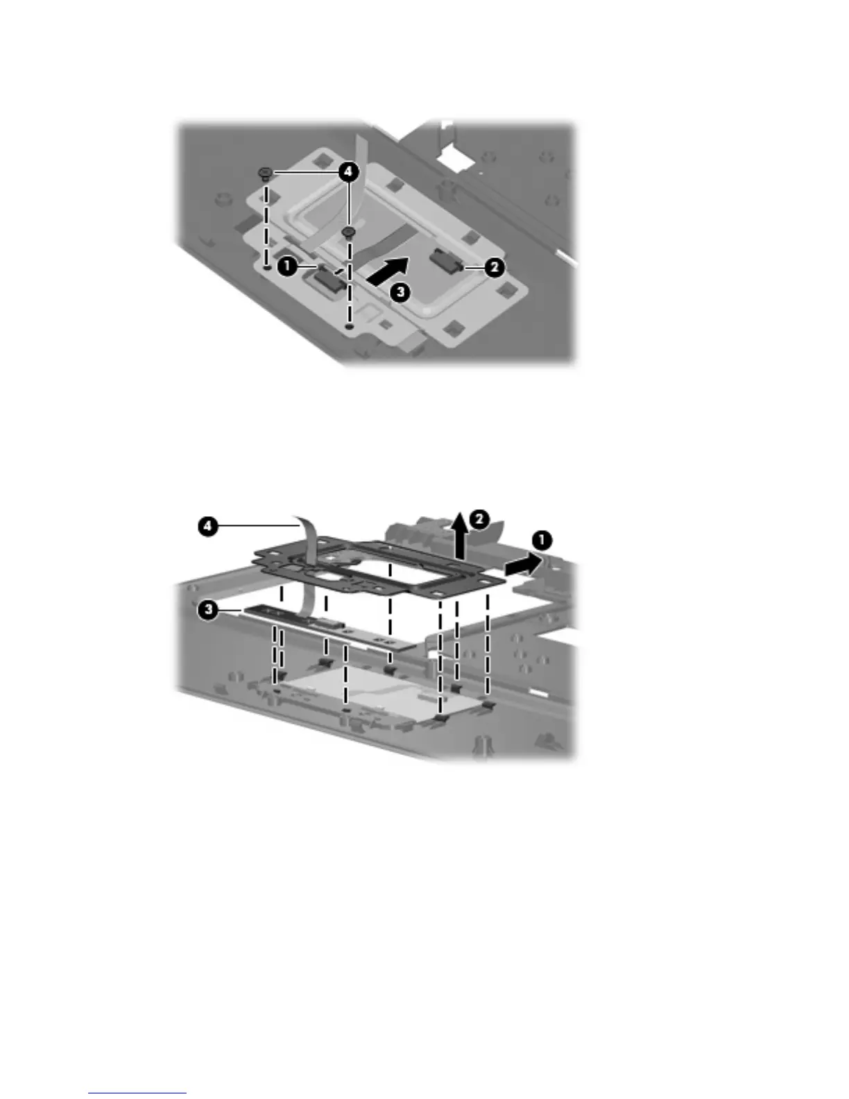 8. Remove the TouchPad button board cable (4) from the opening in the TouchPad bracket.
