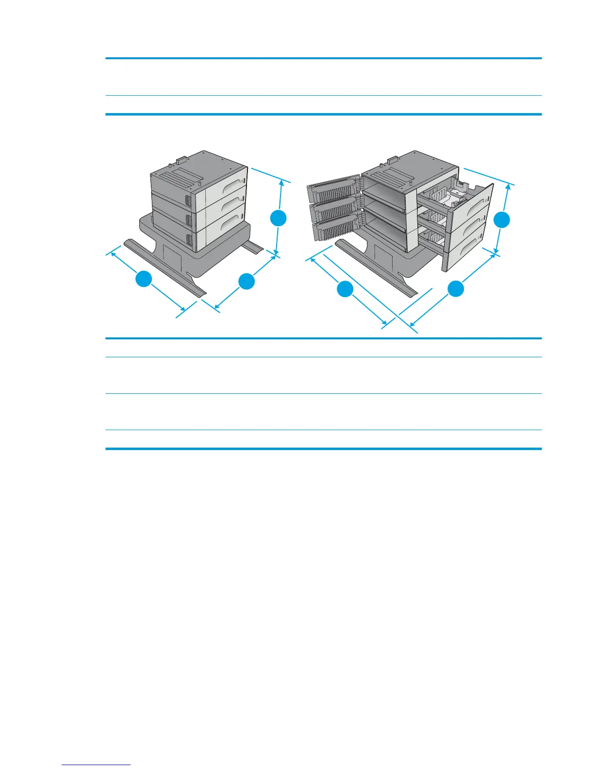 Figure 1-5 Dimensions for the 3 x 500-sheet paper feeder and stand