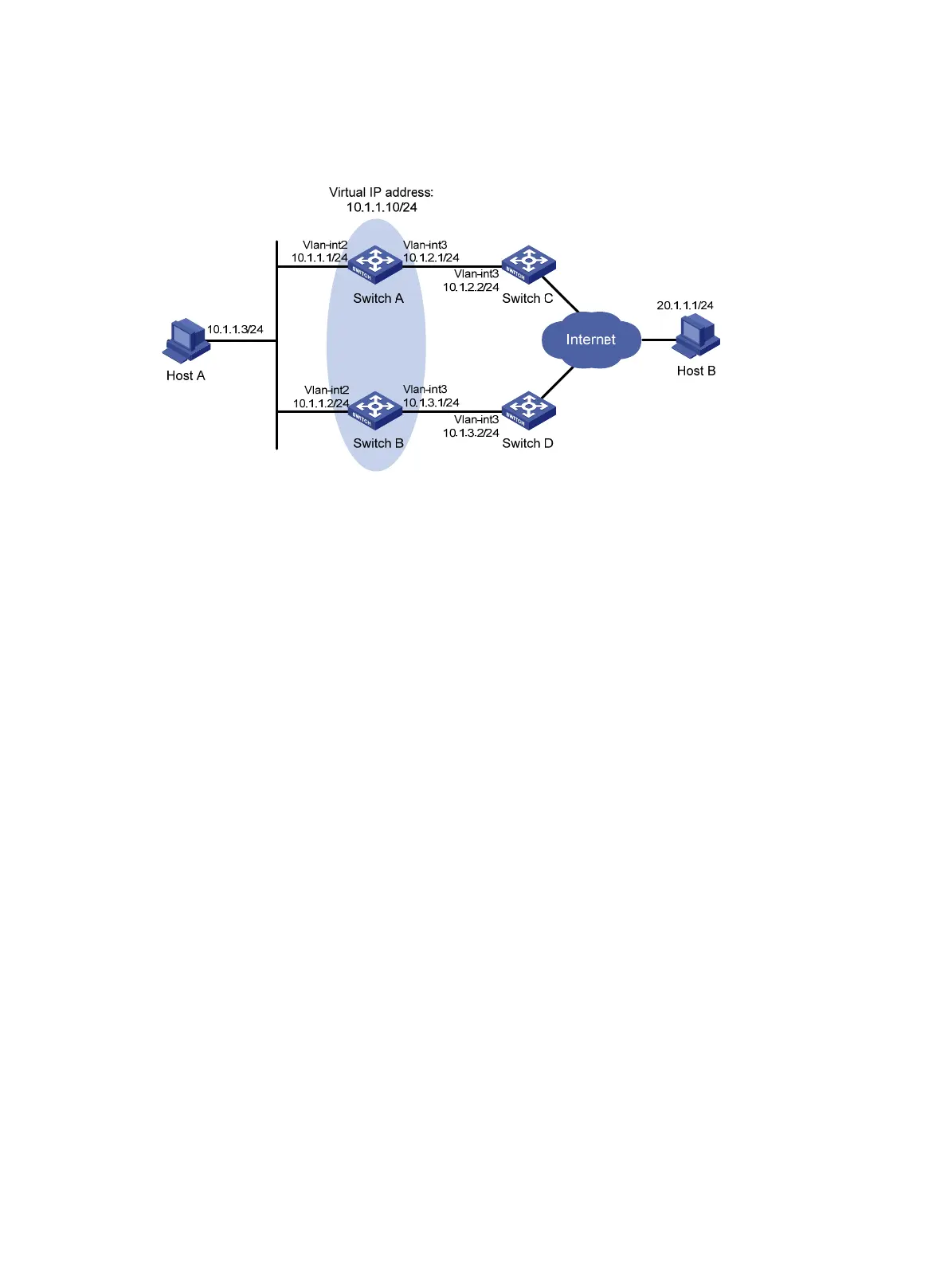 [SwitchB-Vlan-interface2] vrrp vrid 1 virtual-ip 10.1.1.10