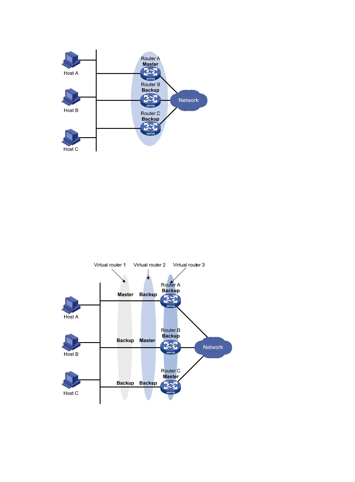 Router C are backups in listening state. When Router A fails, Router B and Router C elect a new master