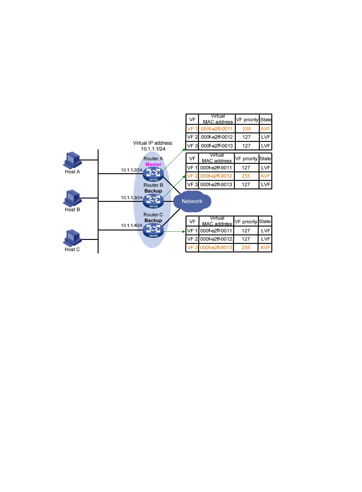 • The VF 1 instance on Router A (the VF 1 owner) has priority 255 and acts as the AVF to forward