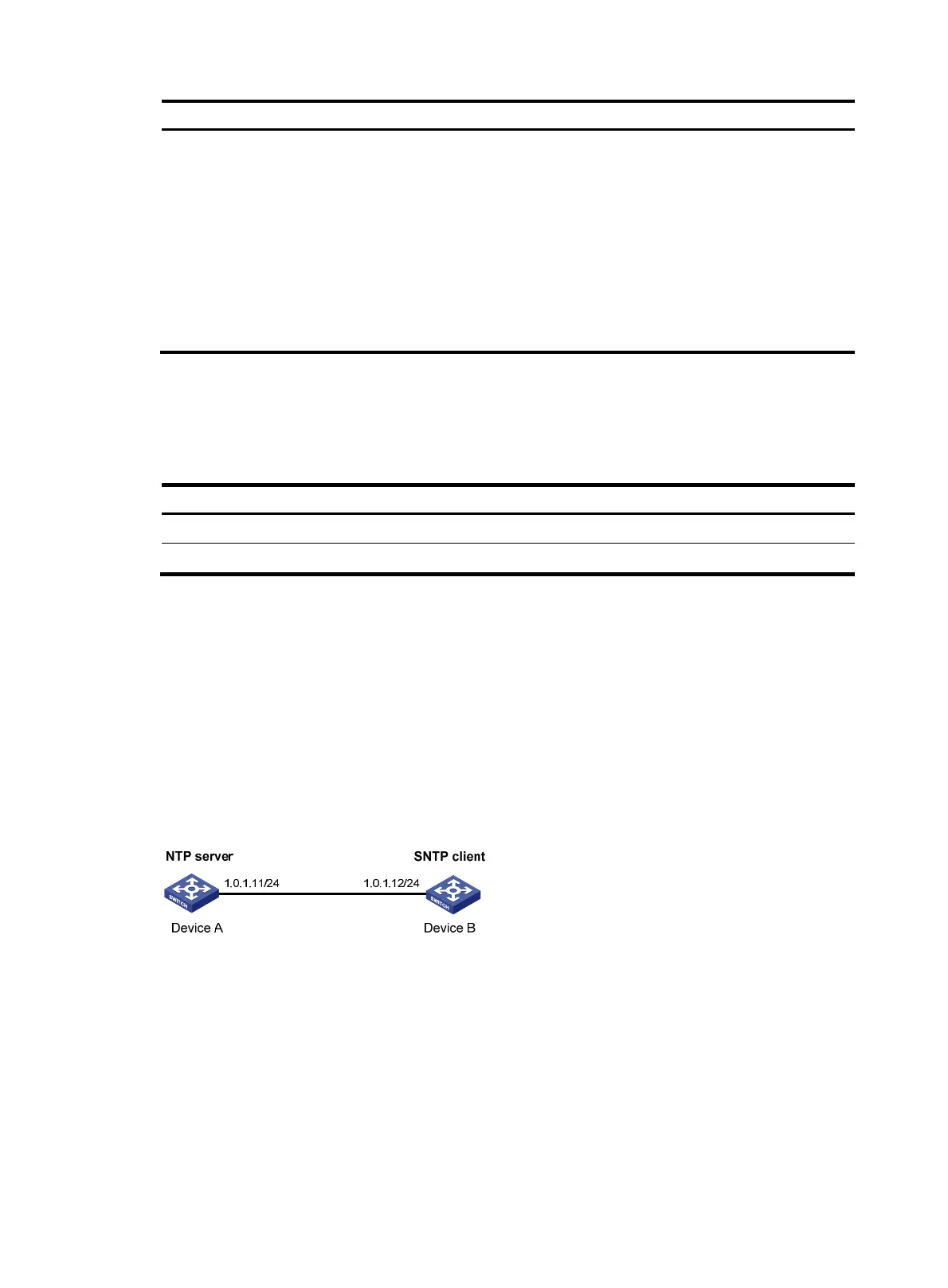 • Configure Device B to operate in SNTP client mode, and specify Device A as the NTP server.