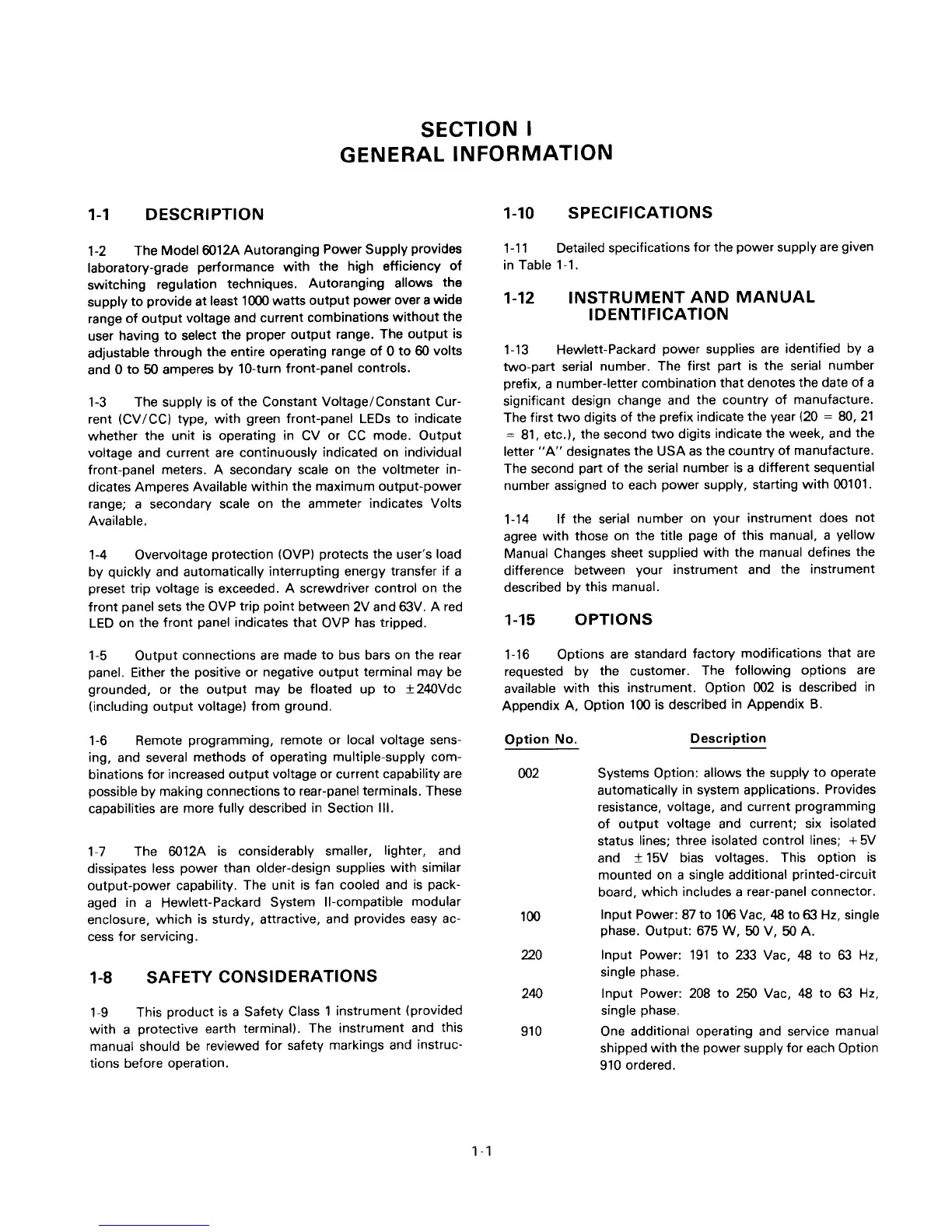 HP 6012A - Description; Instrument and Manual Identification; Options