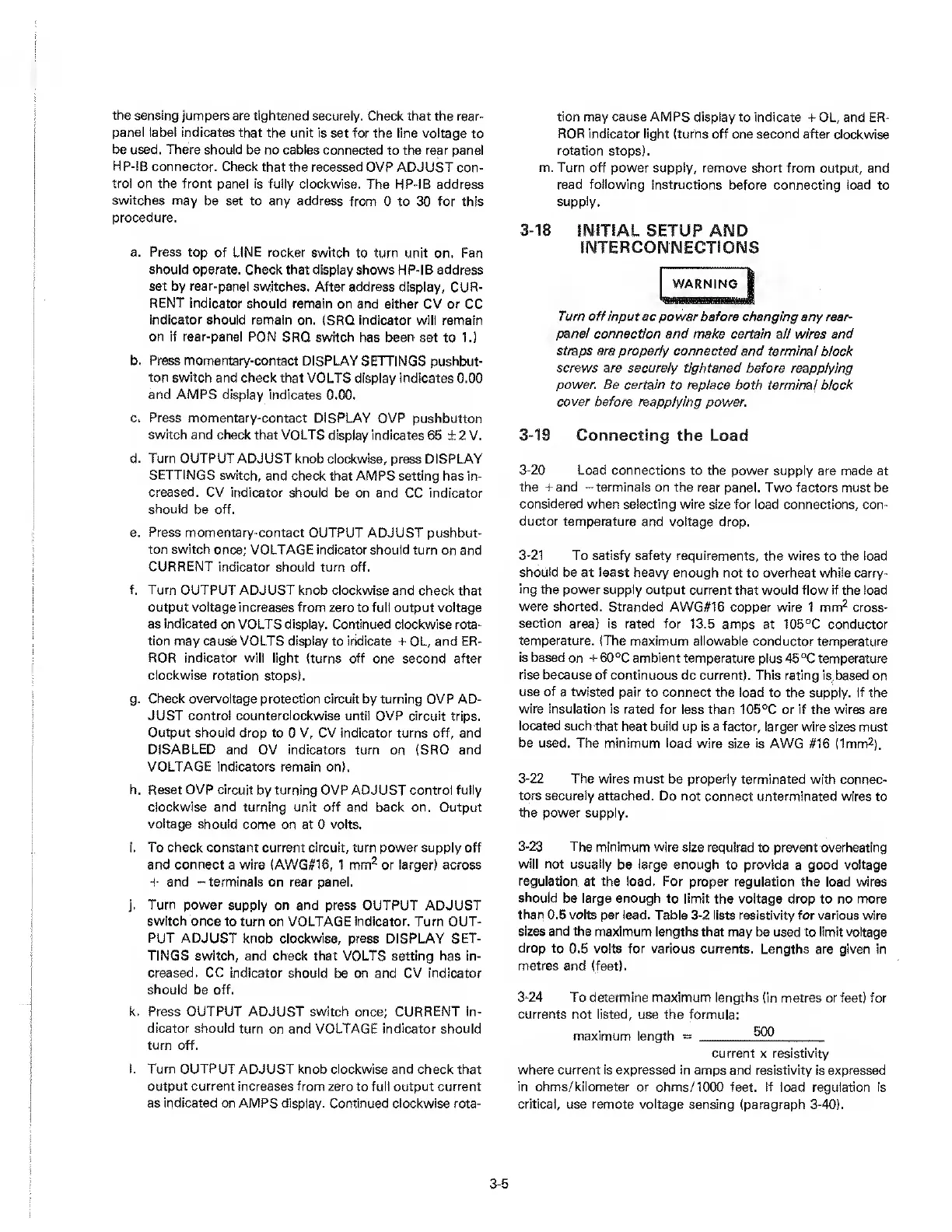 HP 6038A - 3-18 INITIAL SETUP AND INTERCONNECTIONS; 3-19 CONNECTING THE LOAD