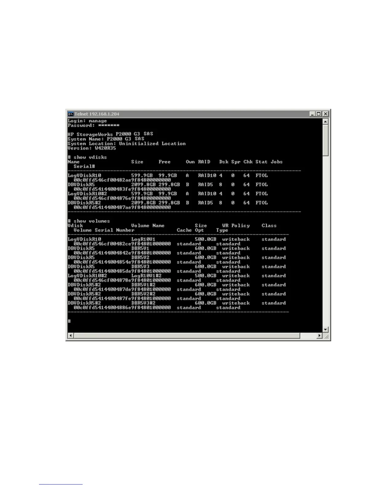 The following image shows a CLI display for the show vdisks and show volumes command.