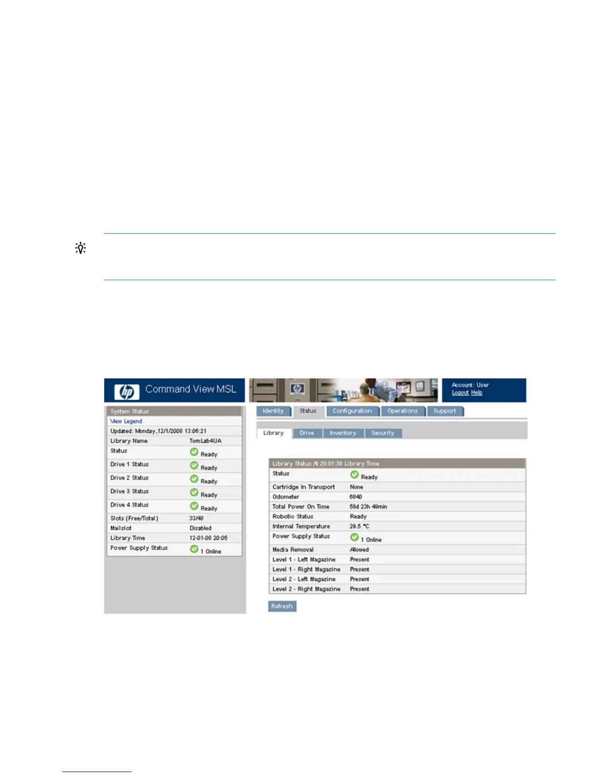 current device and drive status. The System Status pane for the MSL4048, MSL8048, and MSL8096