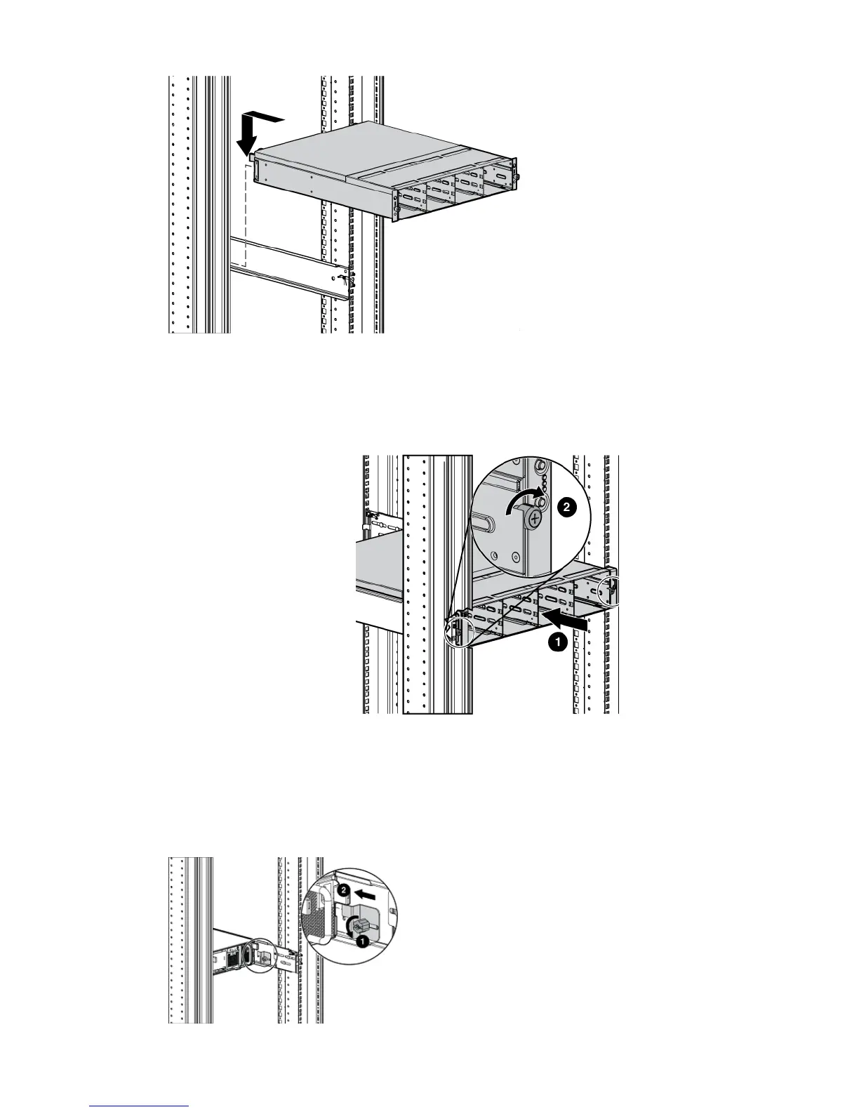 (1, Figure 8 (page 7)). Tighten the enclosure thumbscrews into the rack (2), taking care not to