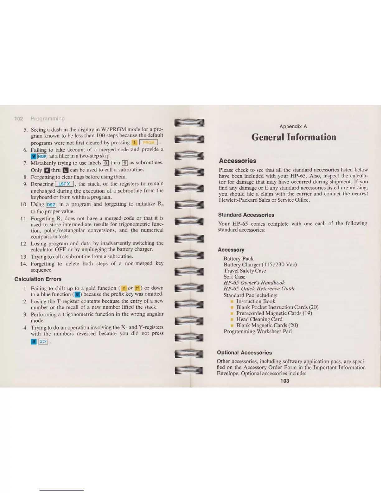 HP 65 - General Information; Calculation Errors; Accessories