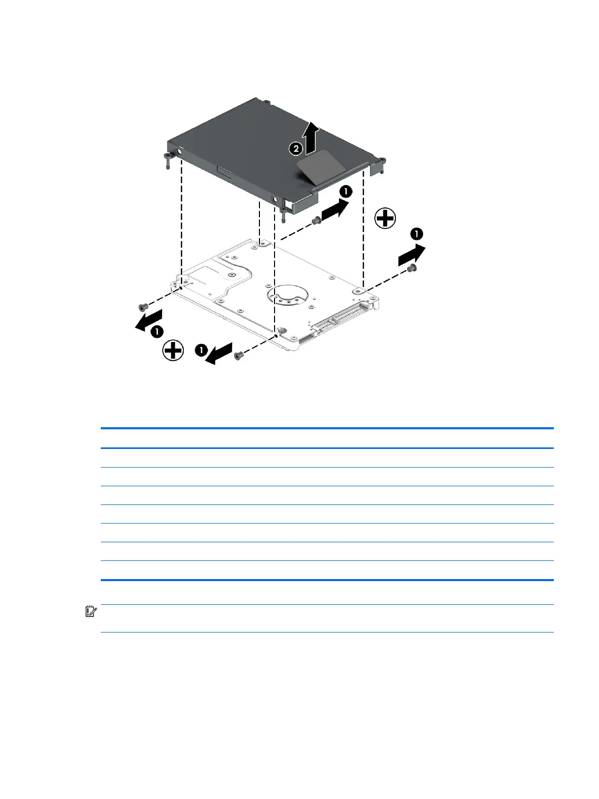 3. If it is necessary to disassemble the hard drive, remove the 4 screws (1), and then remove pull the tab