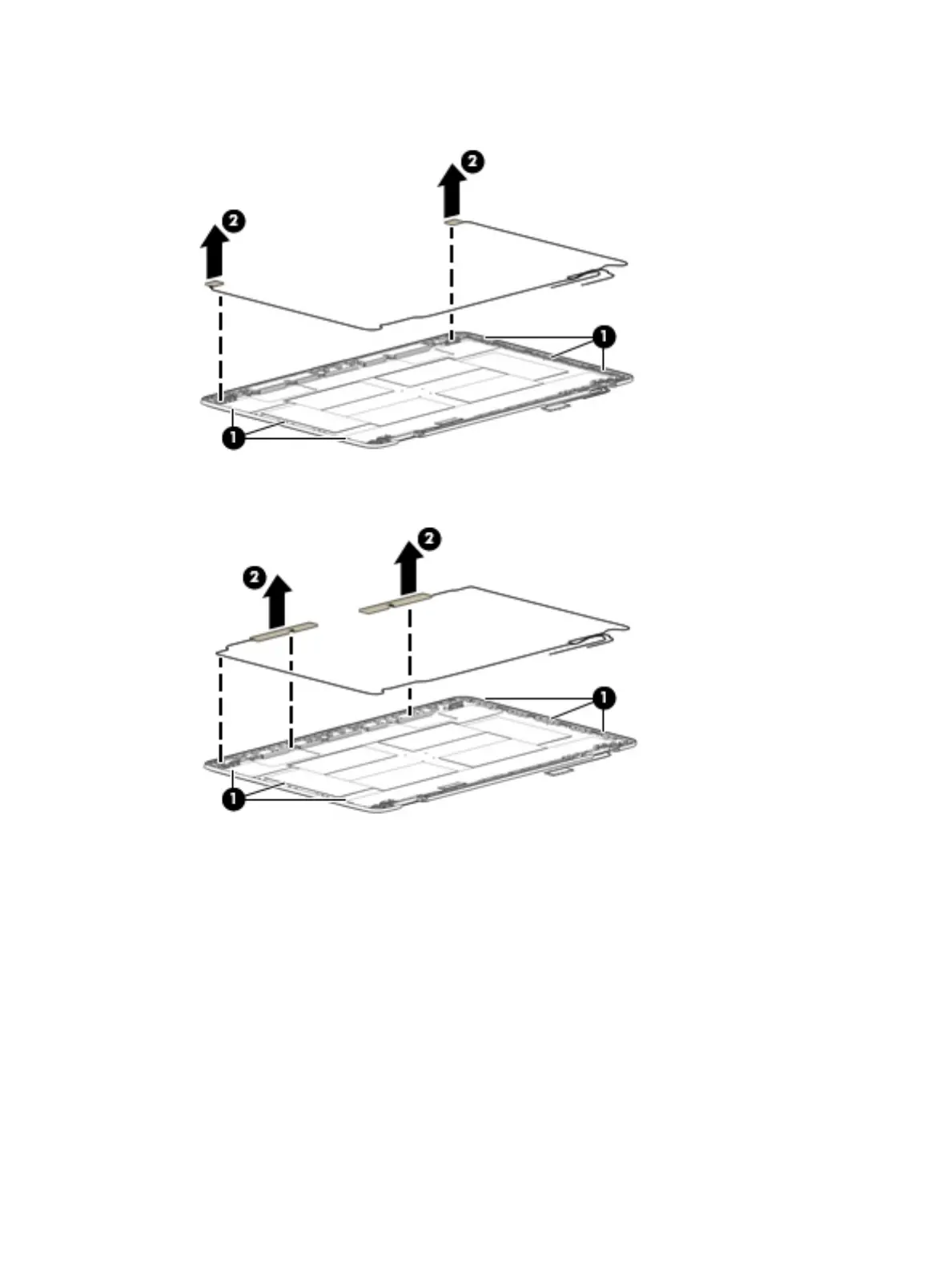4. If it is necessary to replace the WLAN antenna cables, remove the 3 screws from each side (1), and then