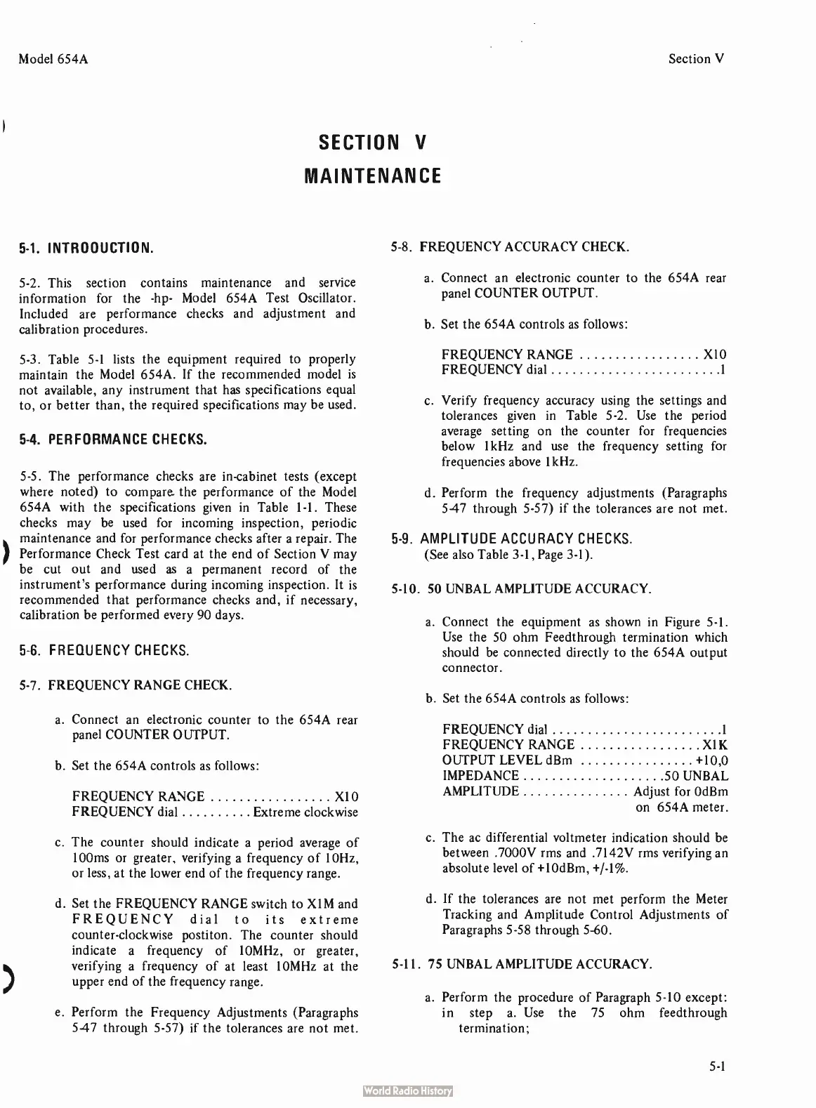 HP 654A - Section V: Maintenance; 5-4. Performance Checks; 5-7. Frequency Range Check; 5-8. Frequency Accuracy Check