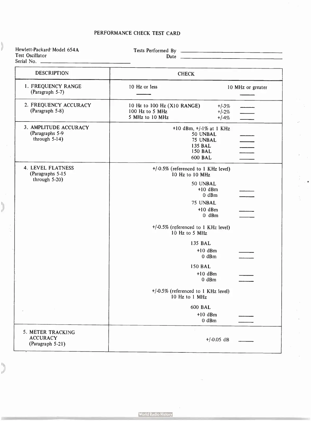 HP 654A - Performance Check Test Card; 1. Frequency Range; 2. Frequency Accuracy; 3. Amplitude Accuracy