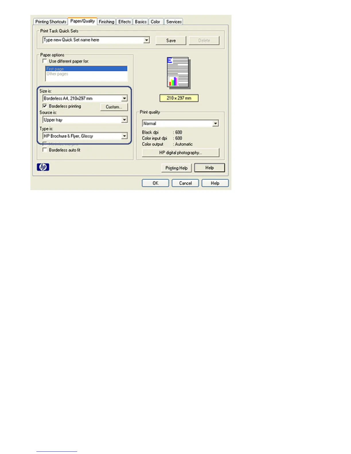 4. Select one of the borderless paper sizes in the Size is drop-