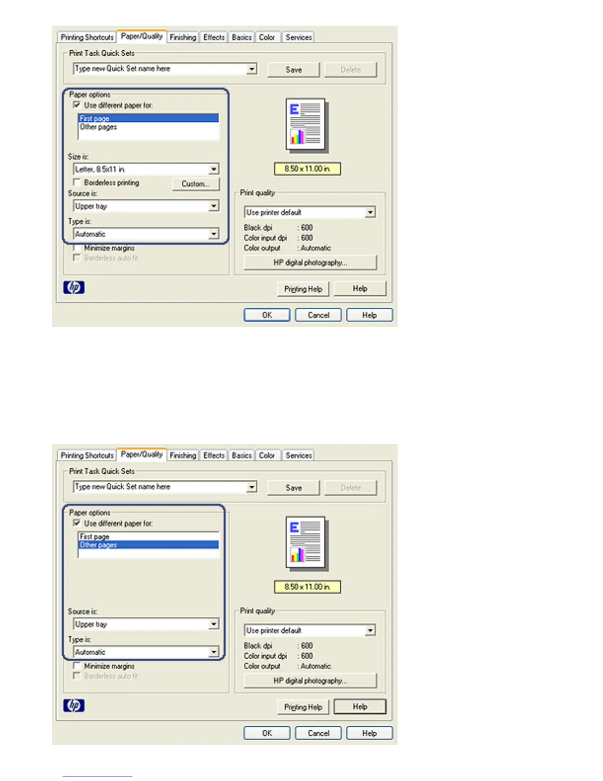5. Select the paper type and paper size for the first page.