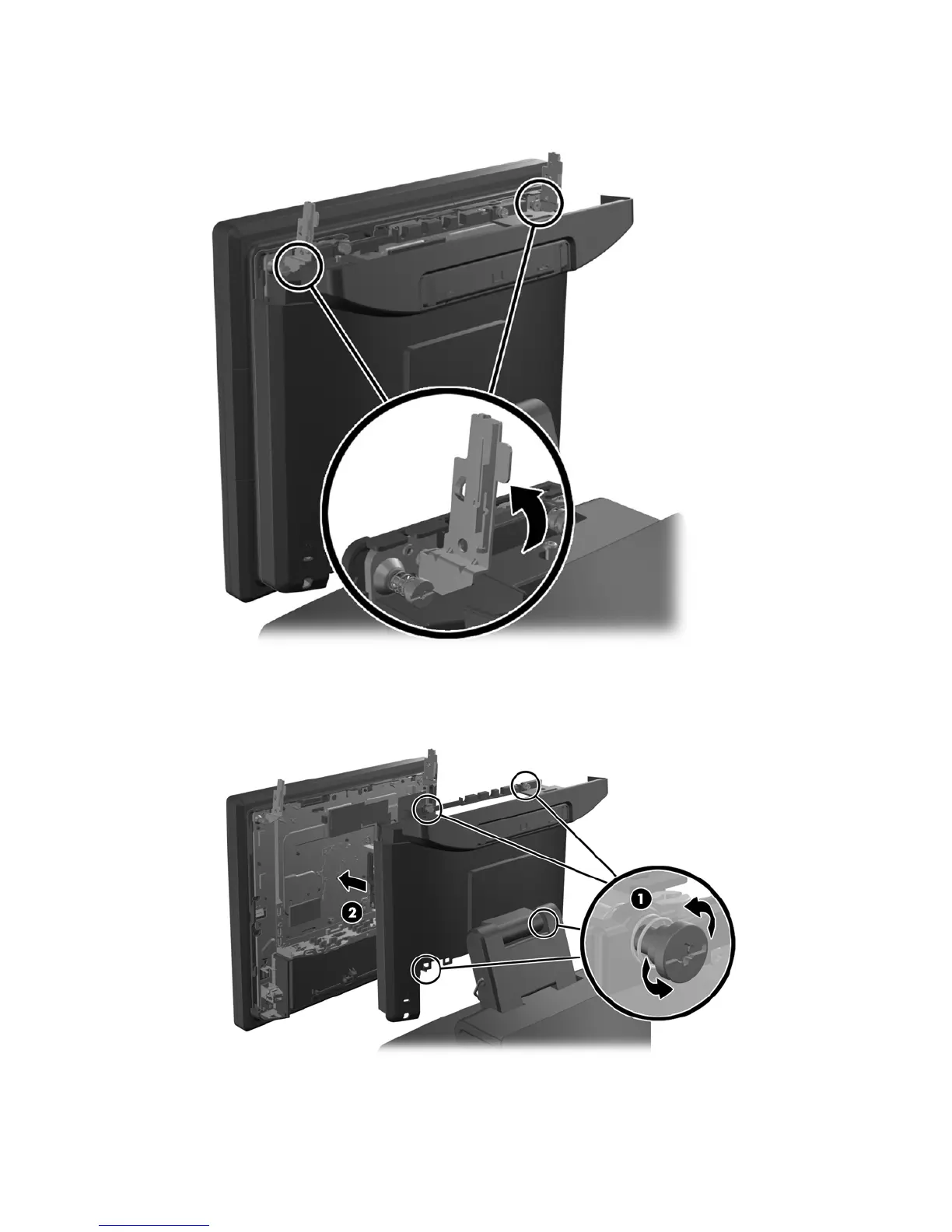 5. Loosen the four captive screws that secure the computer panel to the back plate (1) and pull the