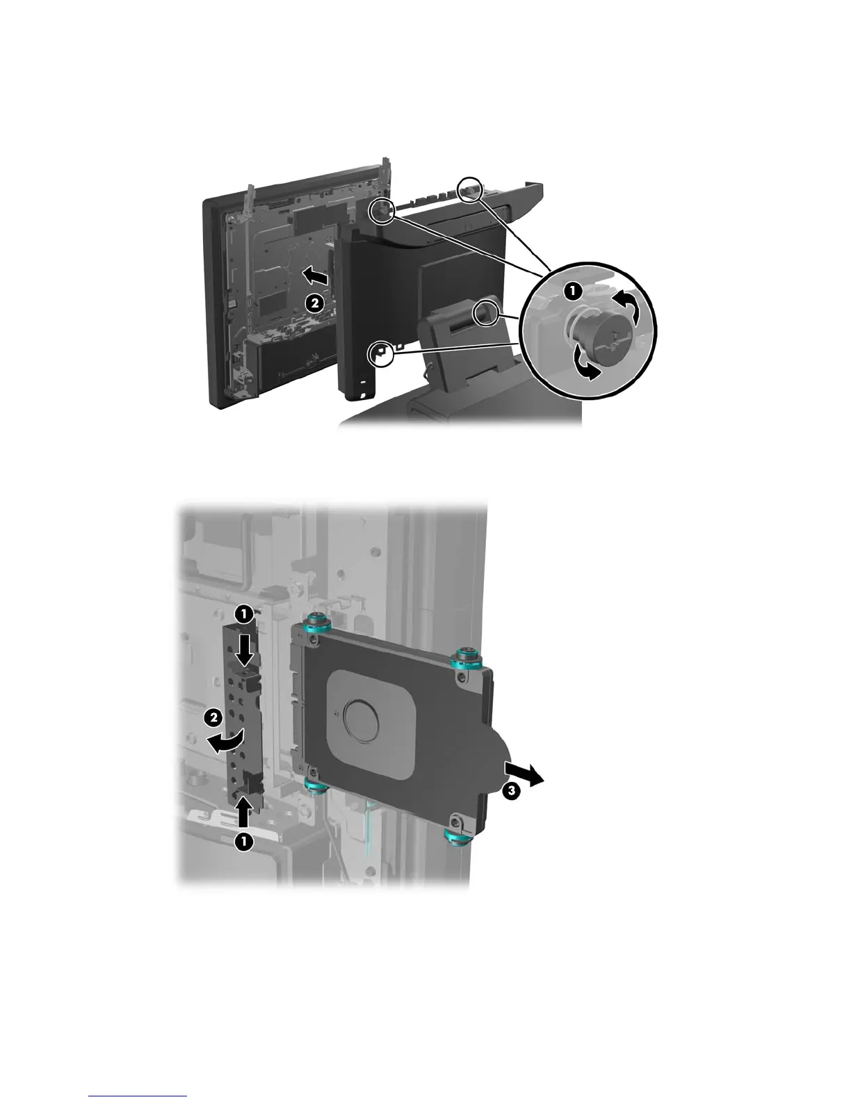 6. Pinch the two tabs together on the hard drive door (1) and rotate it open (2), then grasp the pull