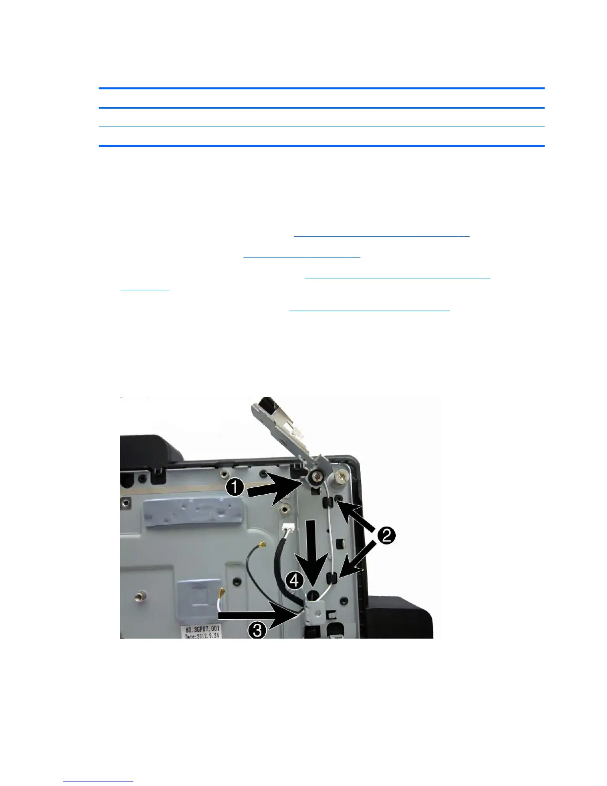 to the top of the computer. The black antenna routes from the WLAN module, through to the back of