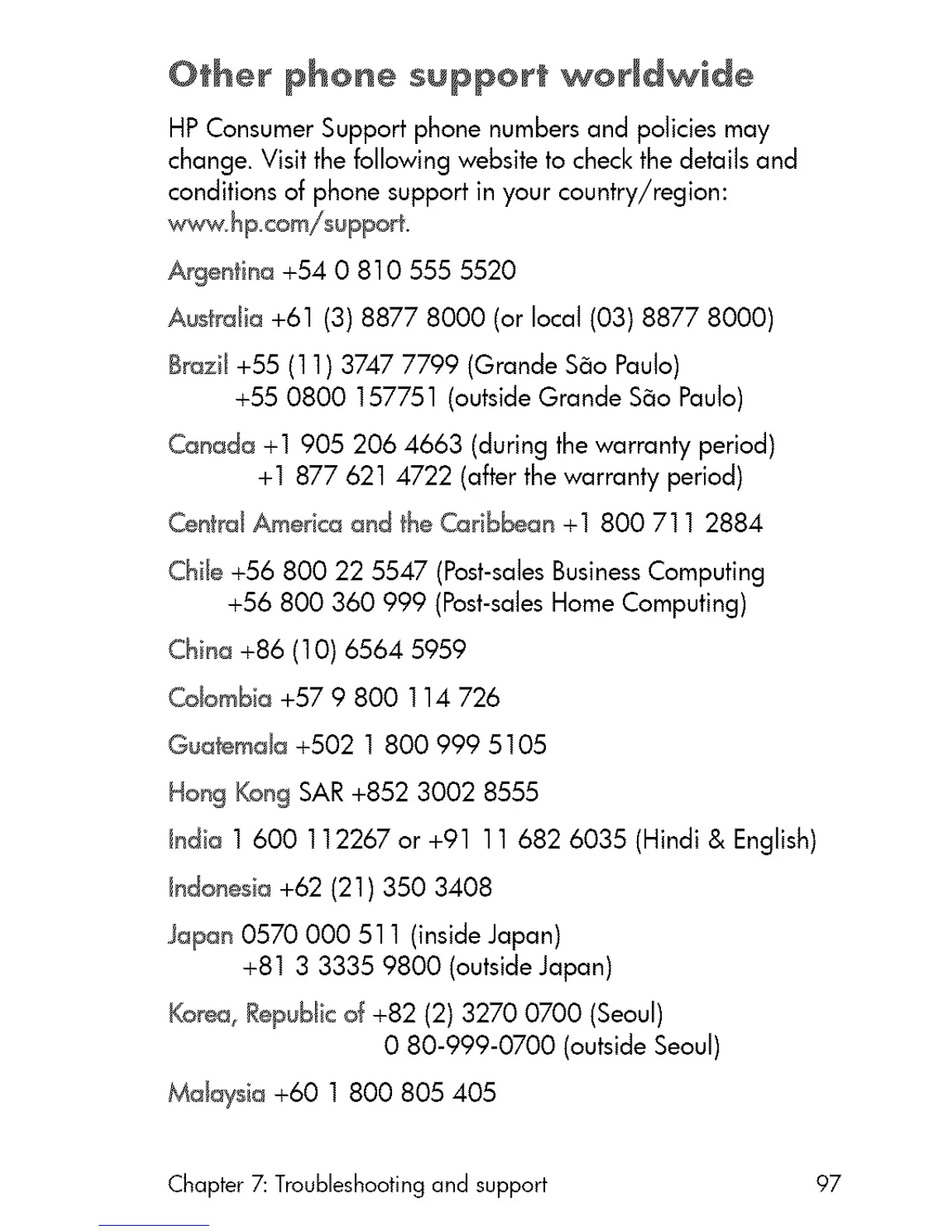 HP Consumer Support phone numbers and policies may