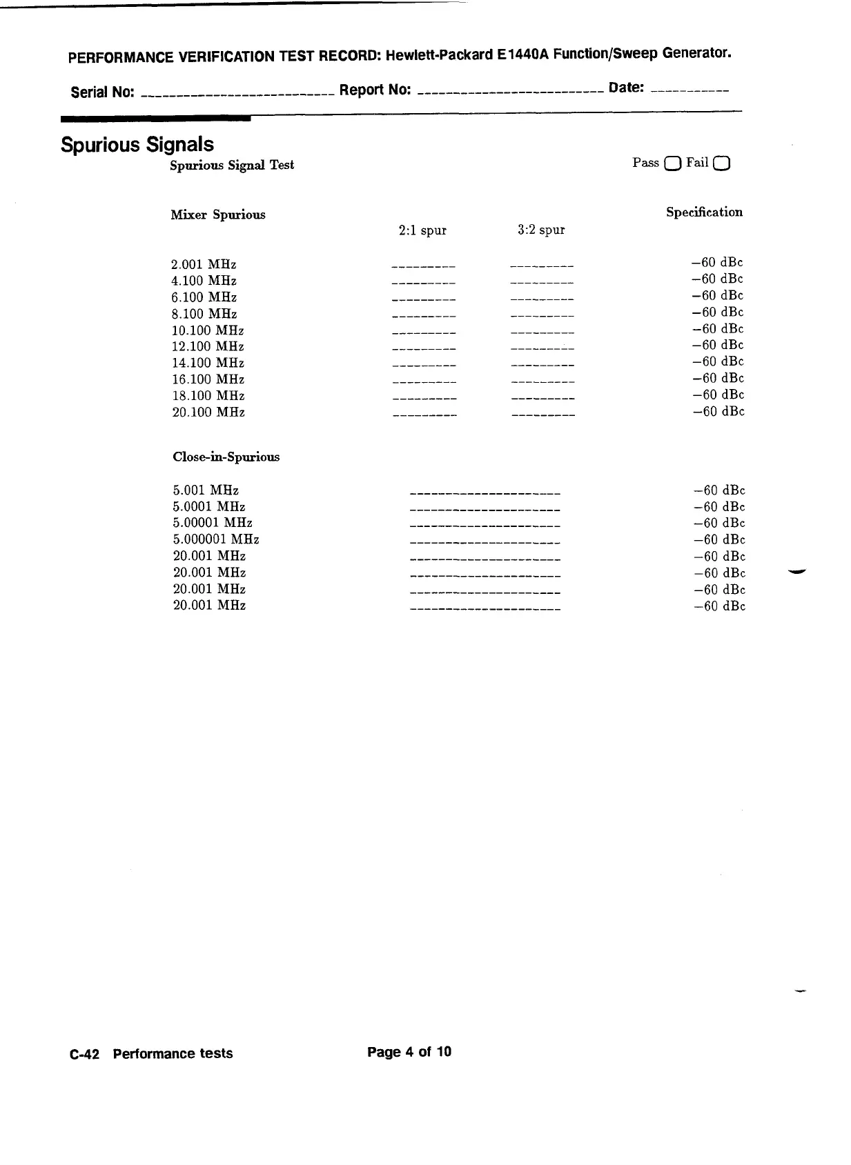 PERFORMANCE VERIFICATION TEST RECORD: Hewlett-Packard