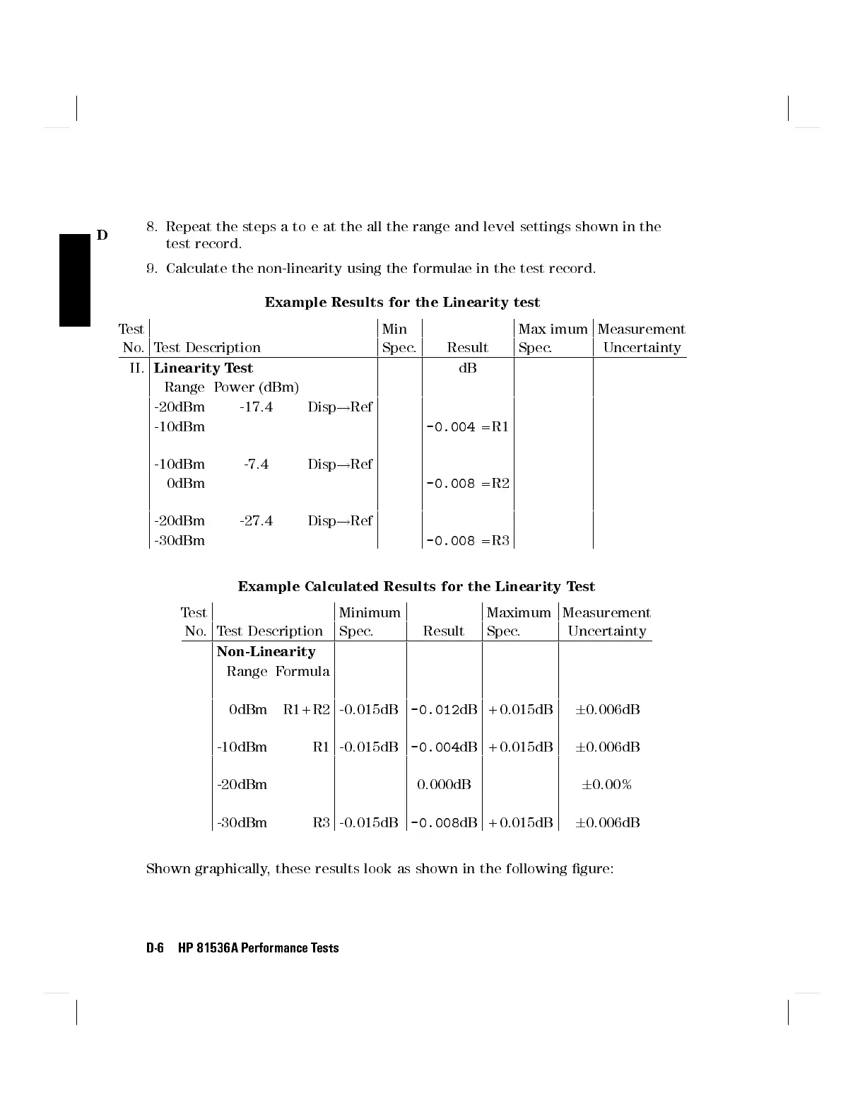 Example Calculated Results for the Linearity Test