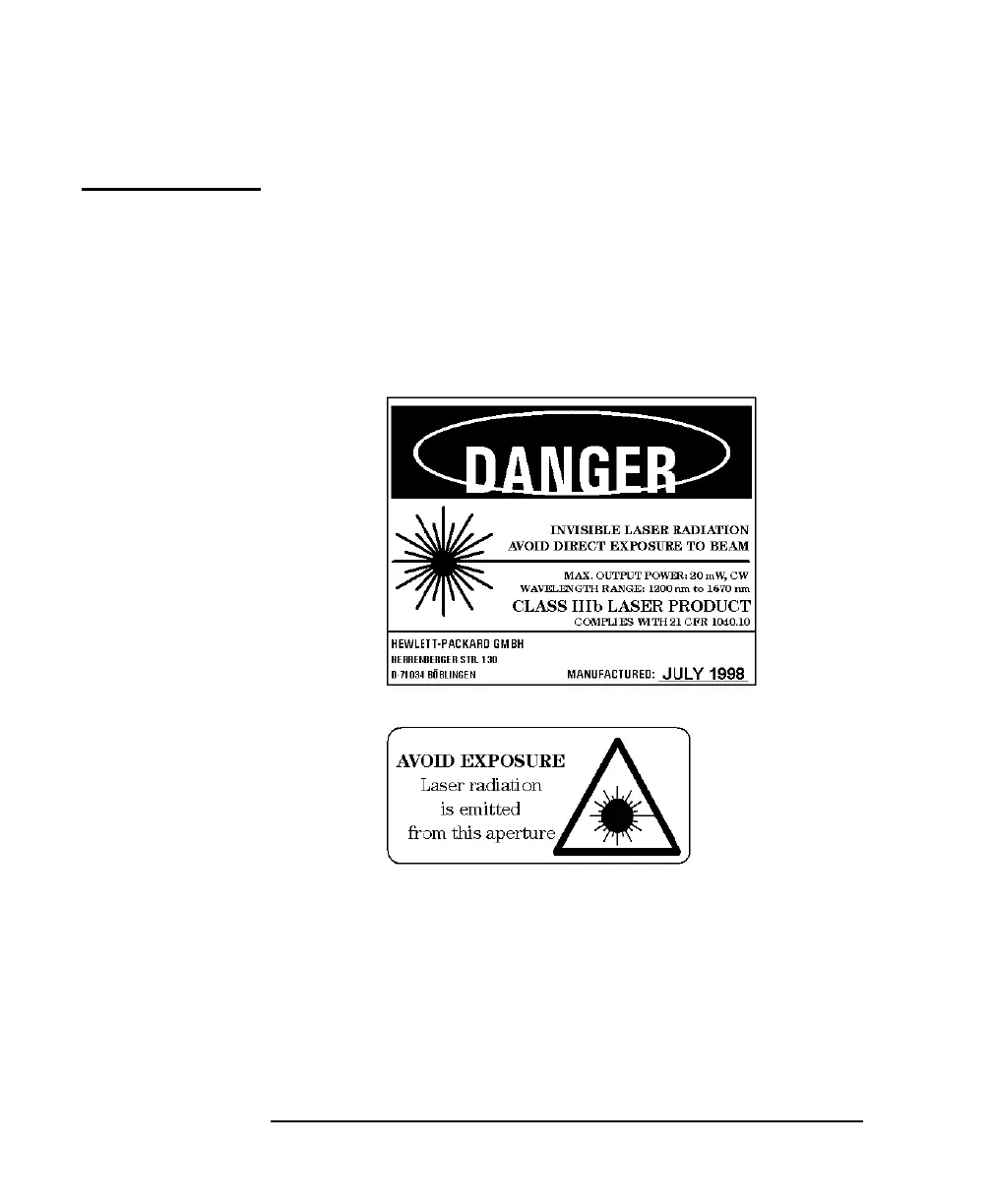 These laser safety warning labels are fixed on the outside of the HP 8164A