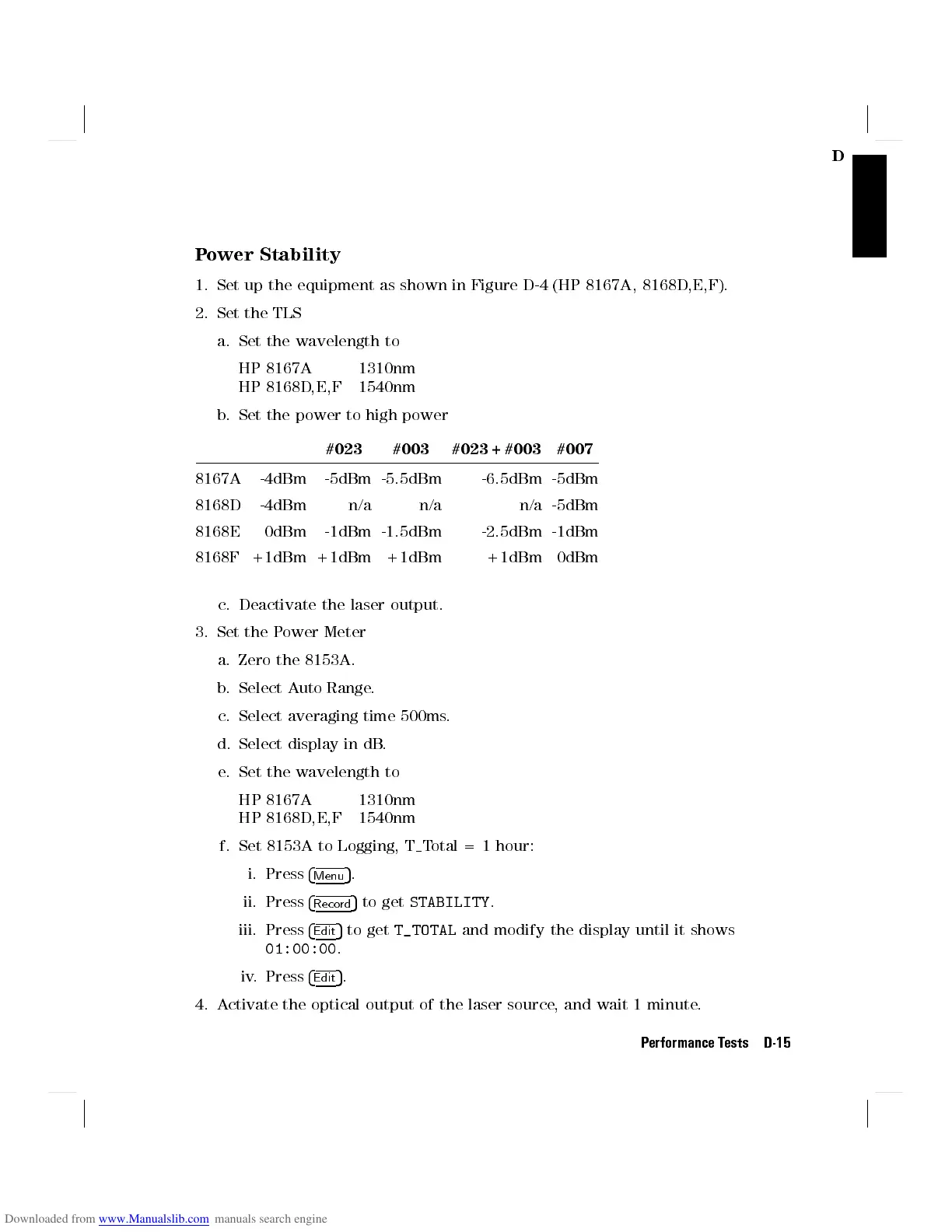 1. Set up the equipment as shown in Figure D-4 (HP 8167A, 8168D