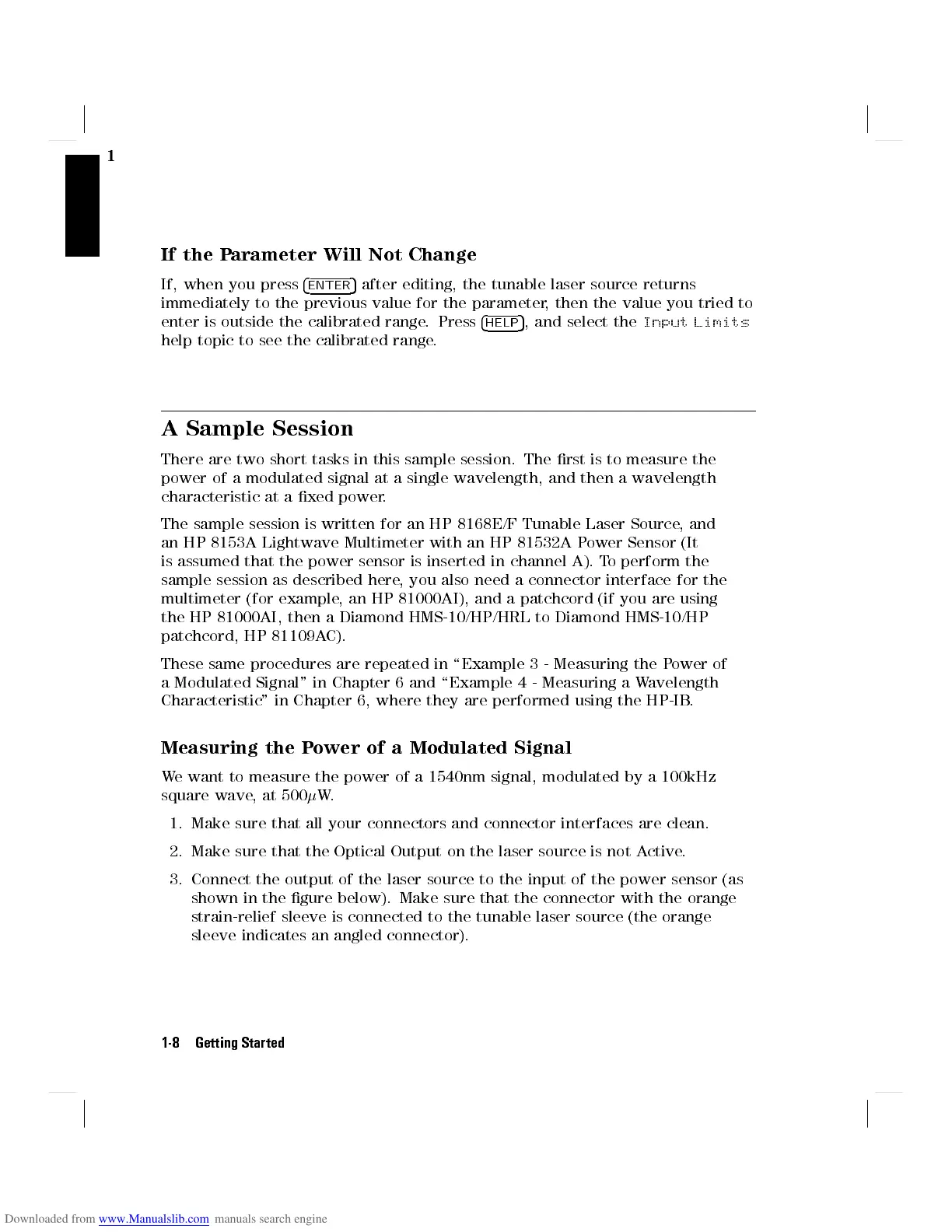 The sample session is written for an HP 8168E/F Tunable Laser Source