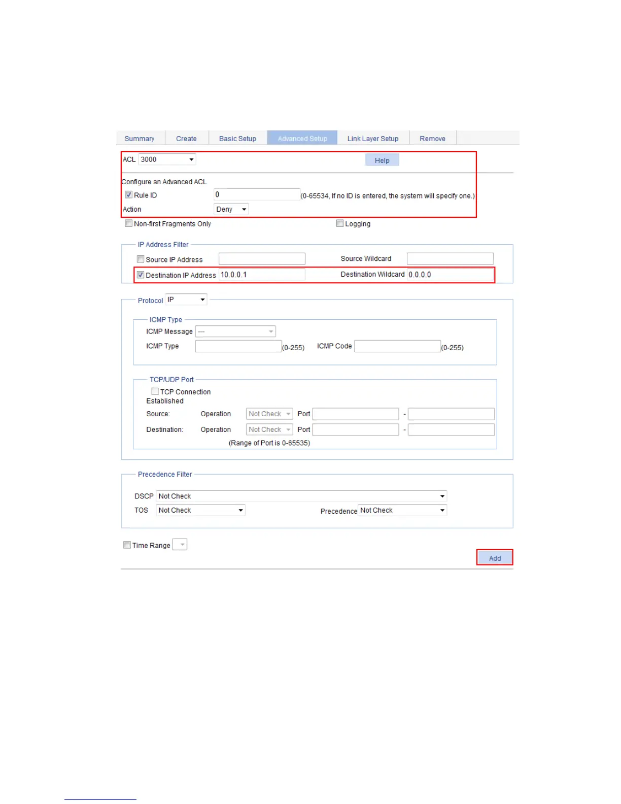 c. Select the Destination IP Address box, enter the destination IP address 10.0.0.1, and enter the