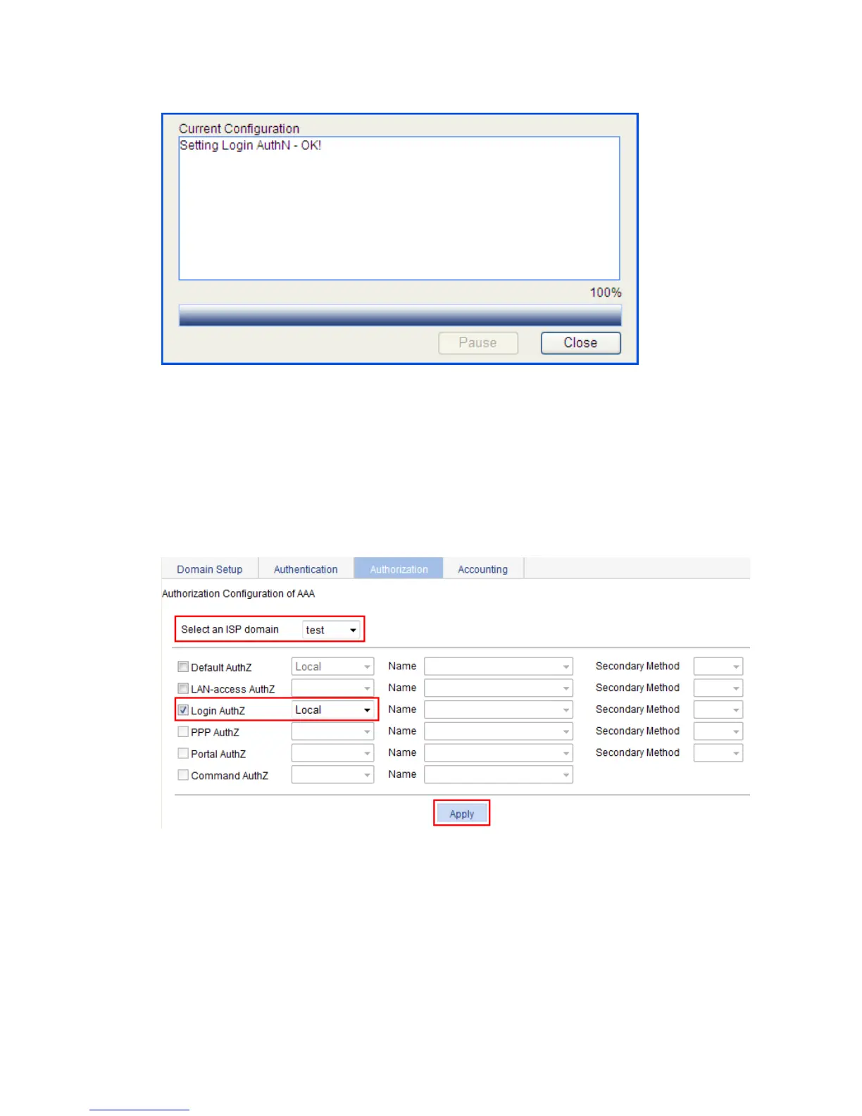b. Select the domain test, the Login AuthZ box, and authorization method Local.