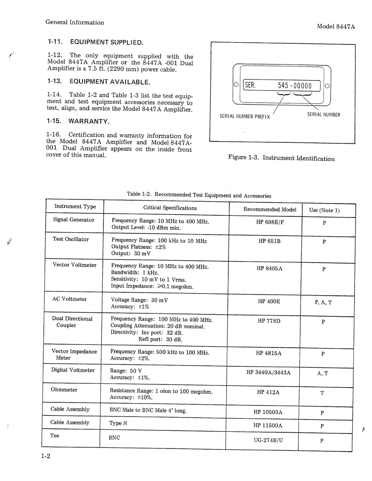 HP 8447A - Equipment Supplied; Equipment Available; Warranty
