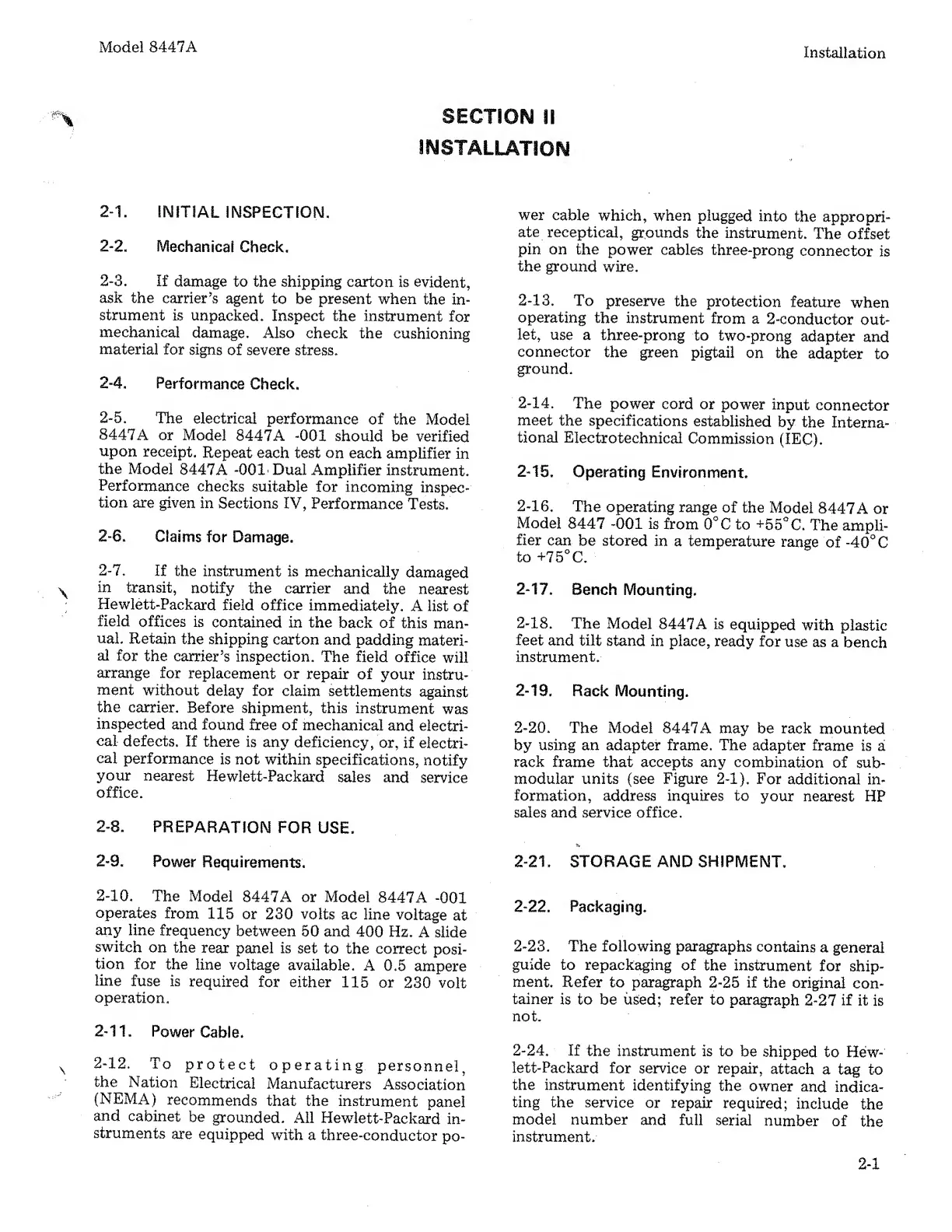 HP 8447A - Installation; Initial Inspection; Preparation for Use; Storage and Shipment