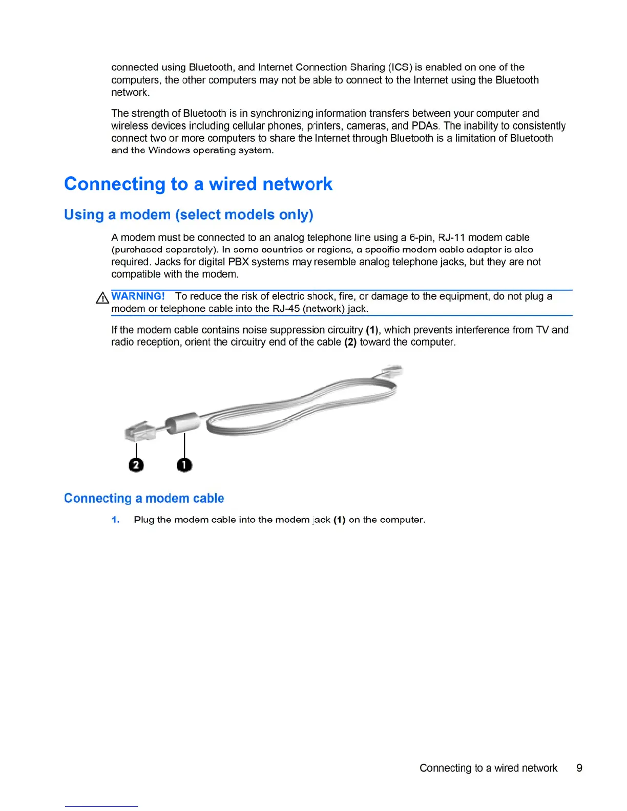 HP 8460p - Connecting to a Wired Network; Using a Modem; Connecting a Modem Cable
