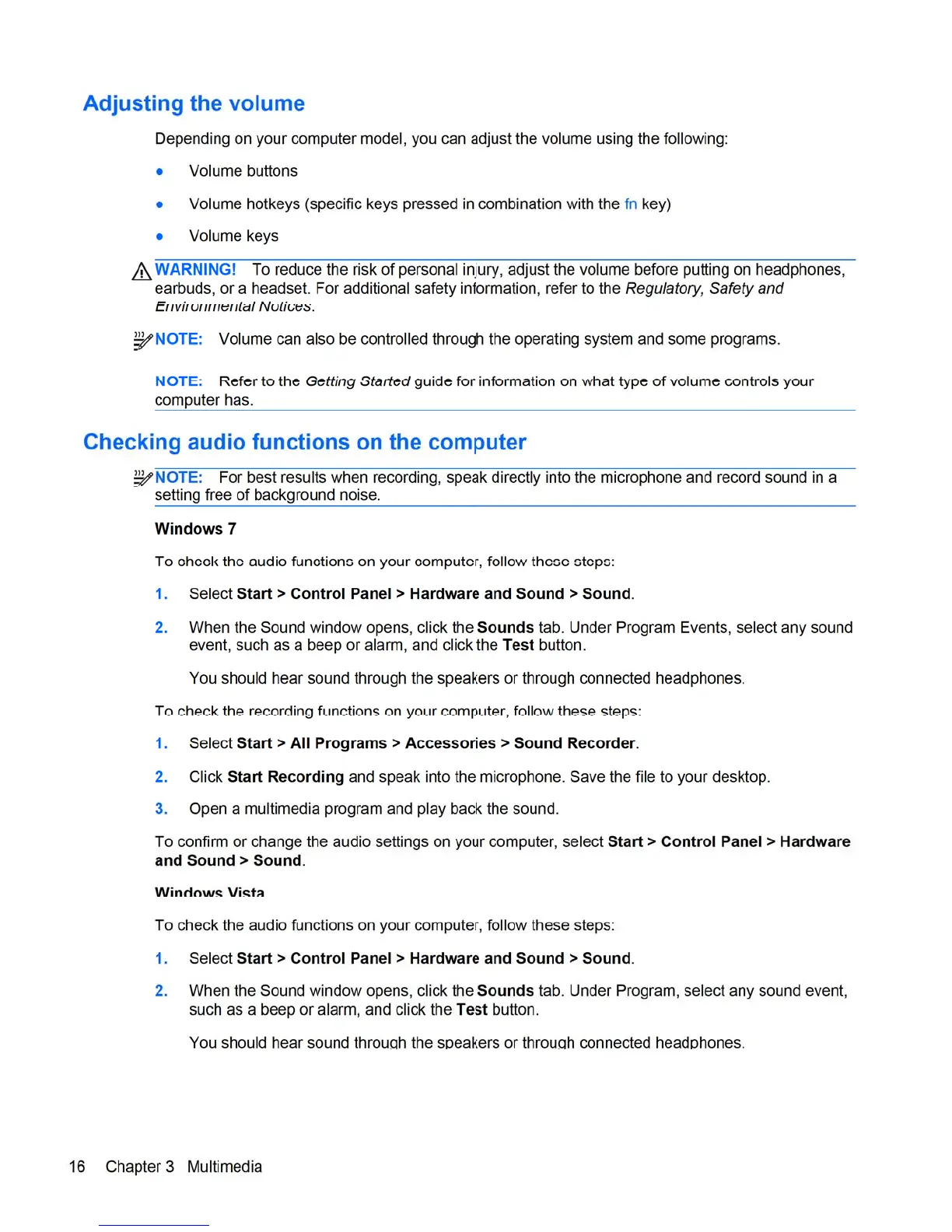 HP 8460p - Adjusting the Volume; Checking Audio Functions on the Computer